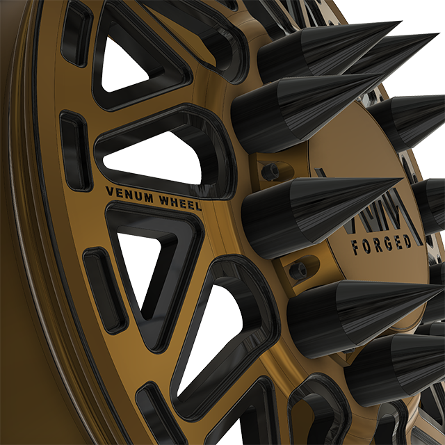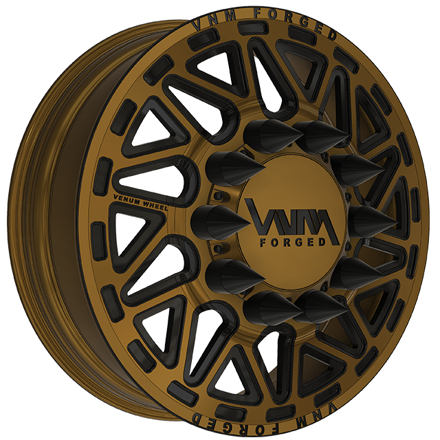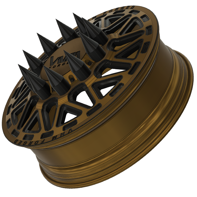 This wheel showcases layered machining with contrast accents that highlight every contour, while the billet VNM Forged center cap and spike lug nut covers deliver a bold, big-rig–inspired attitude. The directional geometry is mirrored correctly for left and right sides, ensuring proper rotation and symmetry across the truck.