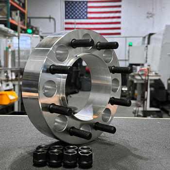 All of our wheel spacers and adapters are proudly made in the USA, custom-crafted from high-quality billet aluminum 6061 T6 and steel 1018 grade. We start by cutting pieces from billet bars using a CNC band saw, followed by precise lathe and milling processes. Our products are made to order, available in sizes ranging from 6mm to 6 inches, and can accommodate wheel combinations from 3 lug to 10 lug.